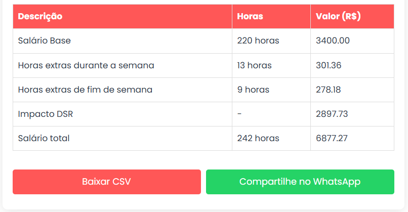 Após clicar em “Calcular”, nossa ferramenta fornece um detalhamento abrangente da sua compensação de horas extras. Entender cada componente ajuda você a verificar se está recebendo um pagamento justo por todas as suas horas extras de trabalho.